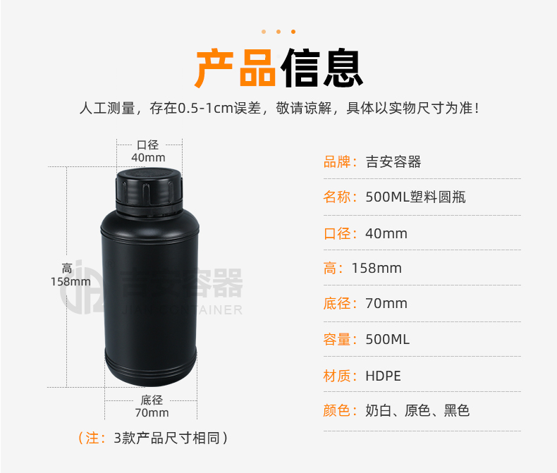 小口塑料瓶采用全新HDPE塑膠原料吹塑而成,具備韌性好、耐酸堿、耐腐蝕、不變形,密封性能佳等特點,可根據(jù)客戶需求定制、改色、產(chǎn)品適用于化工、清洗劑、醫(yī)藥、液體、食品、農(nóng)業(yè)等各行業(yè)包裝。
